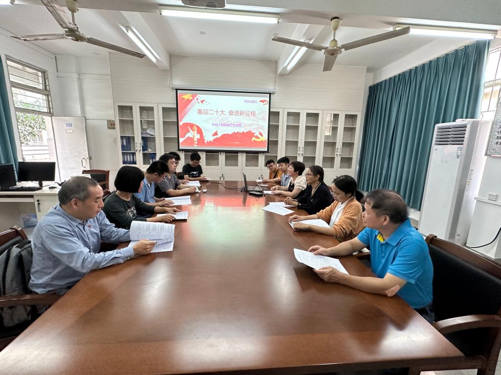 为激发全体党员的爱党爱国热情,增强党性修养,提升能力素质。10月29日下午,机械工程系教工党支部开展了“喜迎二十大 奋进新征程”主题党日活动。主题党日活动围绕学习党的二十大精神、课程教学大纲与课程思政、学生帮扶、校外学生生产实习活动环节等内容进行。