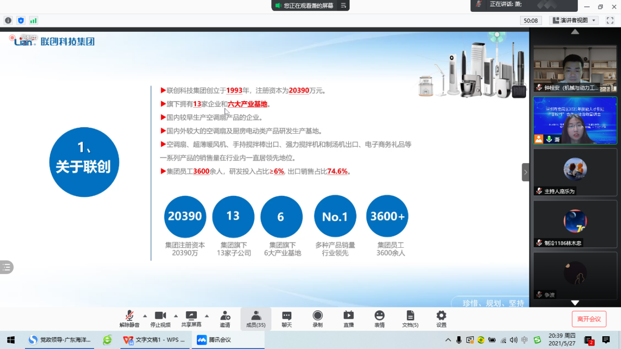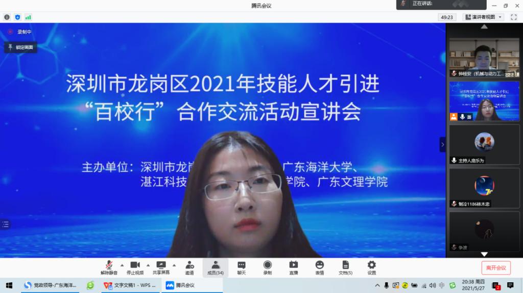 为加强校企合作,解决学生就业问题。5月27日晚,我院通过腾讯会议成功举办深圳市龙岗区2021年引进技能人才“百校行”合作交流活动宣讲会。参加本次网络招聘宣讲会的企业有来自明辉实业(深圳)有限公司、深圳市豪鹏科技股份有限责任公司、深圳市联创科技集团有限公司、深圳市康冠科技股份有限公司等四家用人单位,共为毕业生提供了278个岗位。本次宣讲会共吸引了600余名2021届、2022届毕业生参加了宣讲会。我院领导对此次招聘会高度重视,学院党委副书记钟桂安及2020届、2021届毕业生辅导员老师也参加了本次招聘会。