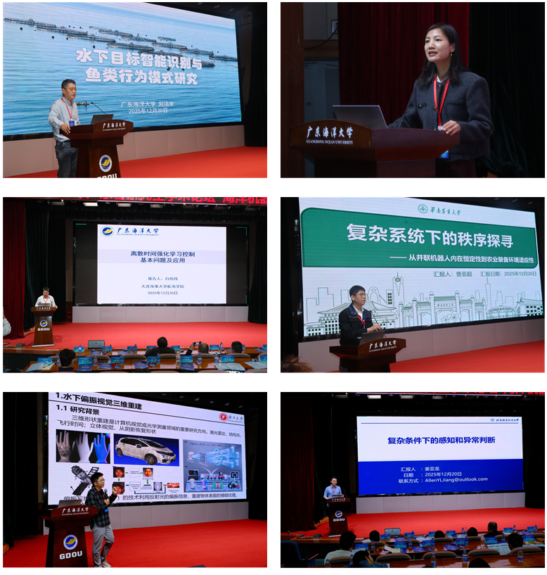 随后,在专家报告环节中,多位学者围绕海洋机器人关键技术进行了分享。我校刘洺辛教授、佛山大学蒋玲莉教授与大连海洋大学白伟伟副教授分别围绕检测识别、轴承保障和离散系统控制等方面研究进行了详细的论述与探讨。此外,华南农业大学曹亚超博士、广西大学万振华博士和北京航空航天大学姜亚龙博士分享了以并联机器人、水下偏振视觉与多要素感知为题的相关研究。