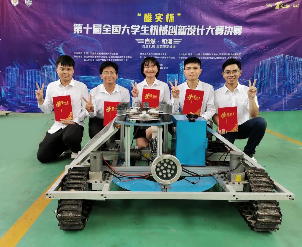 8月22日-23日,“唯实杯”第十届全国大学生机械创新设计大赛在深圳技术大学举行,全国200支参赛队伍进入总决赛。经过激烈角逐,我校机械设计制造及其自动化专业吴志安、陈俊延,电子信息工程专业刘大华,数据科学与大数据应用专业赖永朋和机械电子工程专业邹小田的参赛作品“红树林生态植被修复机器”(指导老师:李德荣、吴敬权)荣获全国一等奖。
