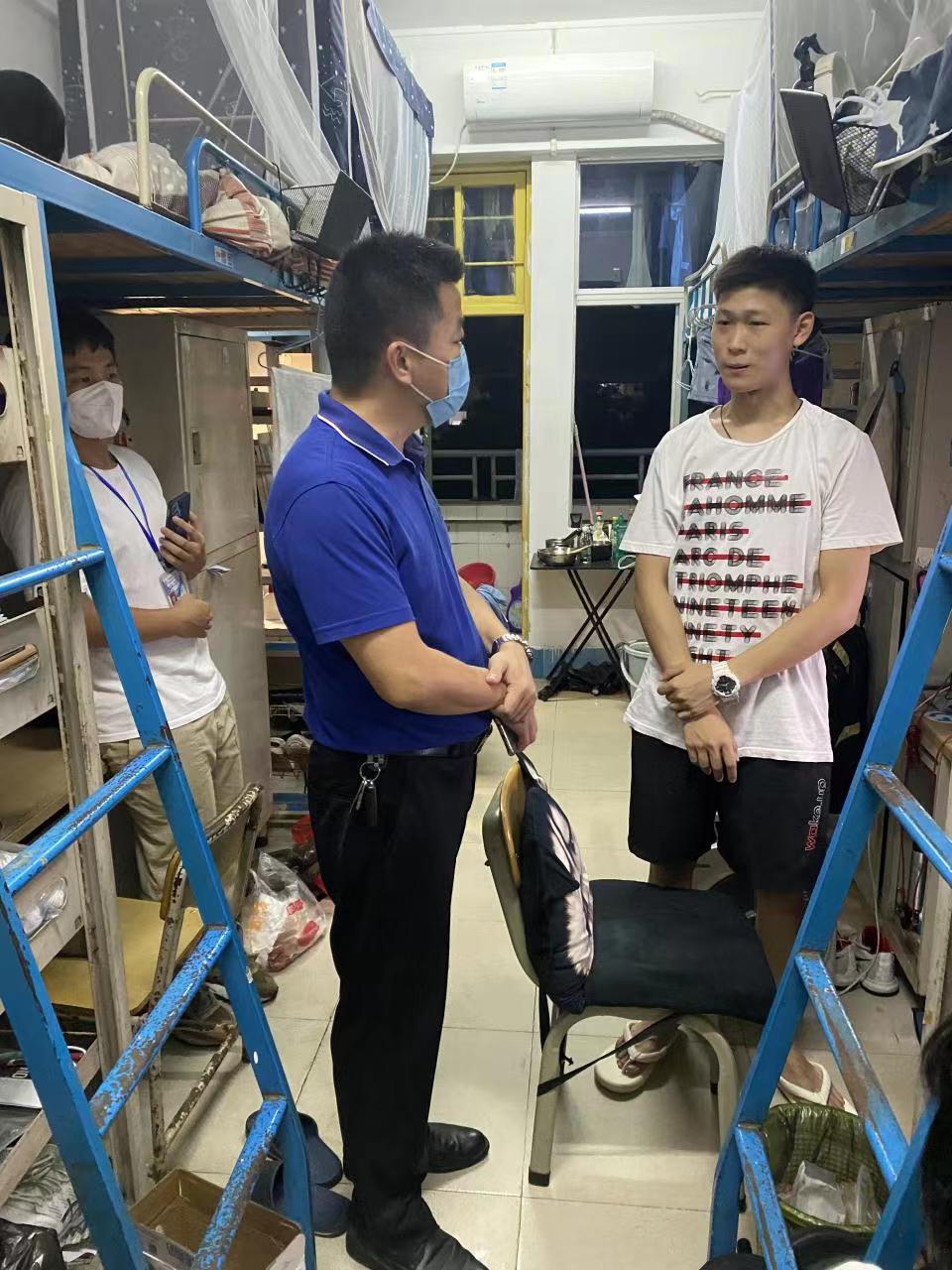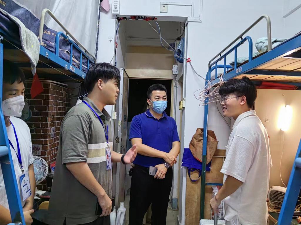 2022年秋季学期开学伊始,为推进学院“三全育人”工作,深入了解返校学生的思想动态、网络上课情况及生活心理状况,8月29日晚,学院党委副书记钟桂安带队深入学生宿舍走访,关心和帮助学生。