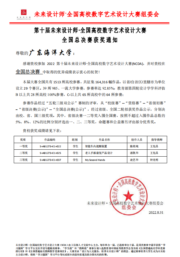近日,第十届全国高校数字艺术设计大赛传出喜讯,我校工业设计专业学生在全国高校数字艺术设计大赛广东省赛区获得广东省一等奖7项、二等奖10项、三等奖14项,在随后进行的全国总决赛中获得一等奖1项、二等奖1项、三等奖1项的佳绩。
