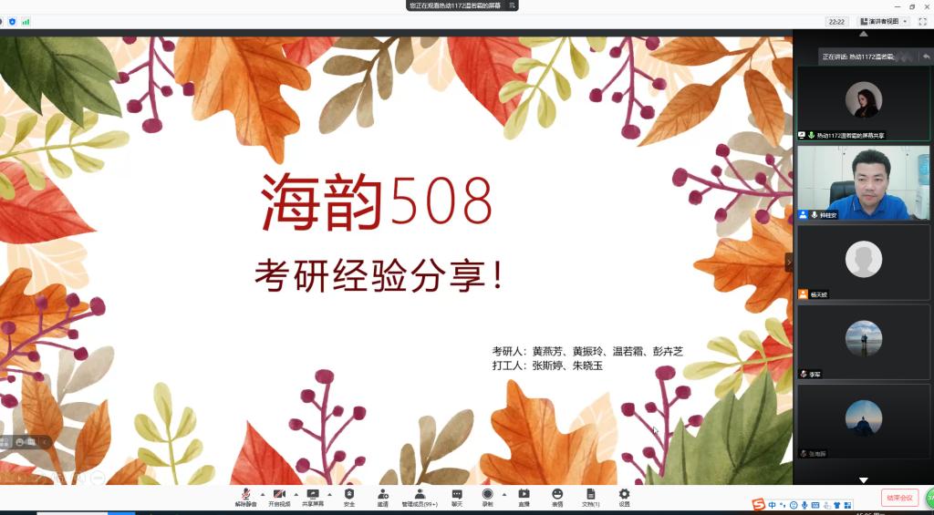 会上,副院长徐青宣读了《机械与动力工程学院关于表彰2021年考研先进集体和先进个人的决定》。随后,制冷1174班班主任李军老师作为考研优秀班级班主任代表进行了发言。李老师从入学之初的专业教育到日常关注学生成绩、充分发挥优秀班助的作用,再到备考期间关注学生心理变化、学校学院对考研工作的高度重视和大力支持等多个方面分析了学生考研成功的因素。接着保研至中南大学的建能1171班吴友健、考取华南理工大学的机制1172班苏达权分别分享了自己保研成功及考研成功的经验;考研优秀宿舍海韵B508宿舍代表黄振玲、海安B612宿舍代表唐雄秋从宿舍关系的处理、室友之间互相鼓励互相帮助等角度分享了考研心得。