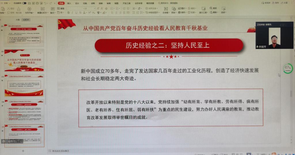 2022年3月23日下午,机械与动力工程学院党委书记李国芳通过腾讯会议作了题为《以史为鉴开创未来--从党的百年奋斗历史经验看人民教育千秋基业》的思政第一课,全院入党积极分子140多人听课。李国芳从回顾“两个一百年”奋斗目标的宏伟蓝图、党的第三个历史决议与前两个历史决议的关系、党的第三个历史决议的起草过程、党的第三个历史决议的框架结构和主要内容、从“八个明确”到“十个明确”、马克思主义中国化新的飞跃、深刻认识“两个确立”的重要性等七个方面对党的十九届六中全会的热点进行了解读。并从中国共产党百年奋斗的十条重要历史经验中阐述了党和人民教育事业的艰辛探索实践。他希望,入党积极分子要深入学习贯彻党的十九届六中全会精神,弘扬伟大建党精神,在学习、生活和疫情防控中发挥先锋模范作用。