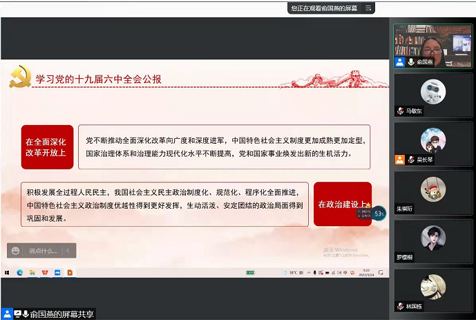 3月24日下午,学院院长俞国燕通过腾讯会议方式为无课的研究生100多人作了题为《学习党的十九届六中全会公报》的思政第一课,她通过十九届六中全会会议情况、中国共产党百年奋斗历程、中国共产党百年奋斗的历史意义等方面系统阐述了十九届六中全会的重大意义和精神内涵。她勉励青年学子,要把握历史发展大势,坚定理想信念,牢记初心使命,始终谦虚谨慎,不骄不躁、艰苦奋斗,以咬定青山不放松的执著奋力实现既定目标,以行百里者半九十的清醒不懈推进中华民族的伟大复兴。