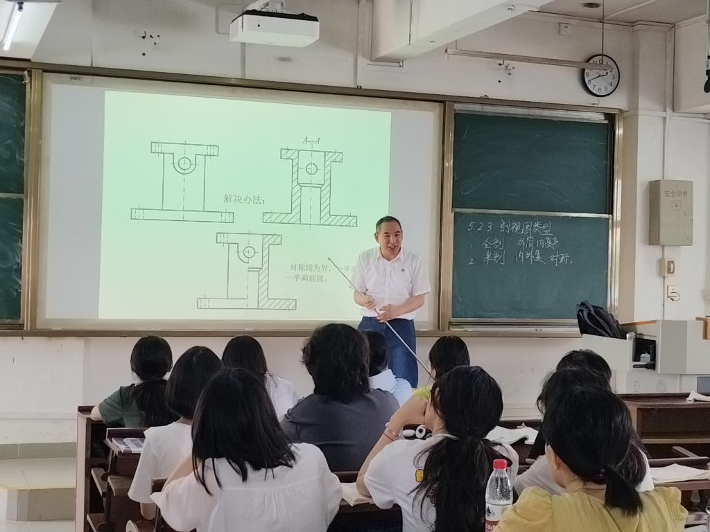 萧时诚老师讲授的《工程机械设计制图》剖视图类型半剖、全剖及题型讲解,课件内容丰富精美,自创的教学平台资源充分,在课前布置练习,前期工作准备充分,线上线下教学将学生作业制成PPT讲解,课堂与学生互动多,丰富的身体语言运用得当,情绪饱满,细节把控到位,并适时融入“精益求精、追求卓越”的工匠精神,结合时政热点,对学生进行鼓励,收到了潜移默化、教书育人的良好效果。