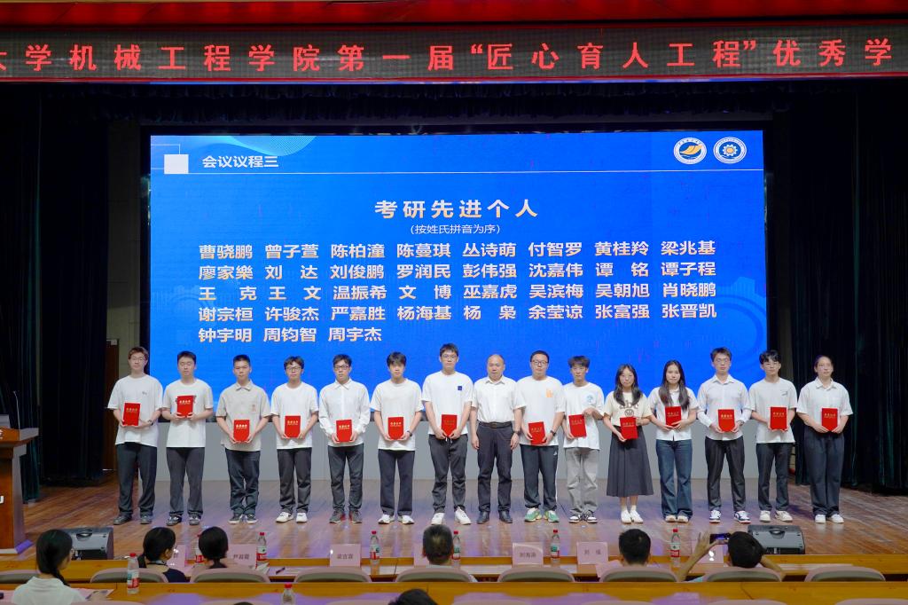 会上,学院副院长刘强宣读了《关于表彰williamhill威廉希尔官网第一届“匠心育人工程”优秀学生的决定》,对在2023-2024学年学风建设中表现突出的集体和个人进行公开表彰。本次表彰共设集体与个人两大类奖项。材料成型及控制工程1212班等4个班级荣获学院先进集体称号;曹骁鹏等140名学生分别摘得“考研先进个人”“学习之星”“科创之星”“励志之星”等多项荣誉。与会领导依次为获奖代表颁发奖状与锦旗。