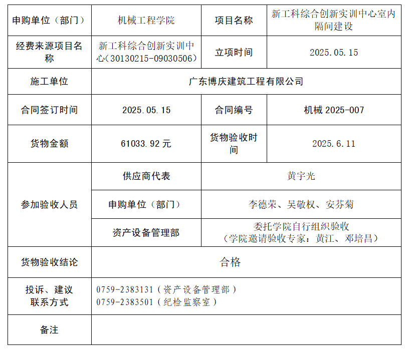 williamhill威廉希尔官网新工科综合创新实训中心室内隔间建设项目已验收,现将验收结果公示,公示时间:2025年6月12日-6月15日。